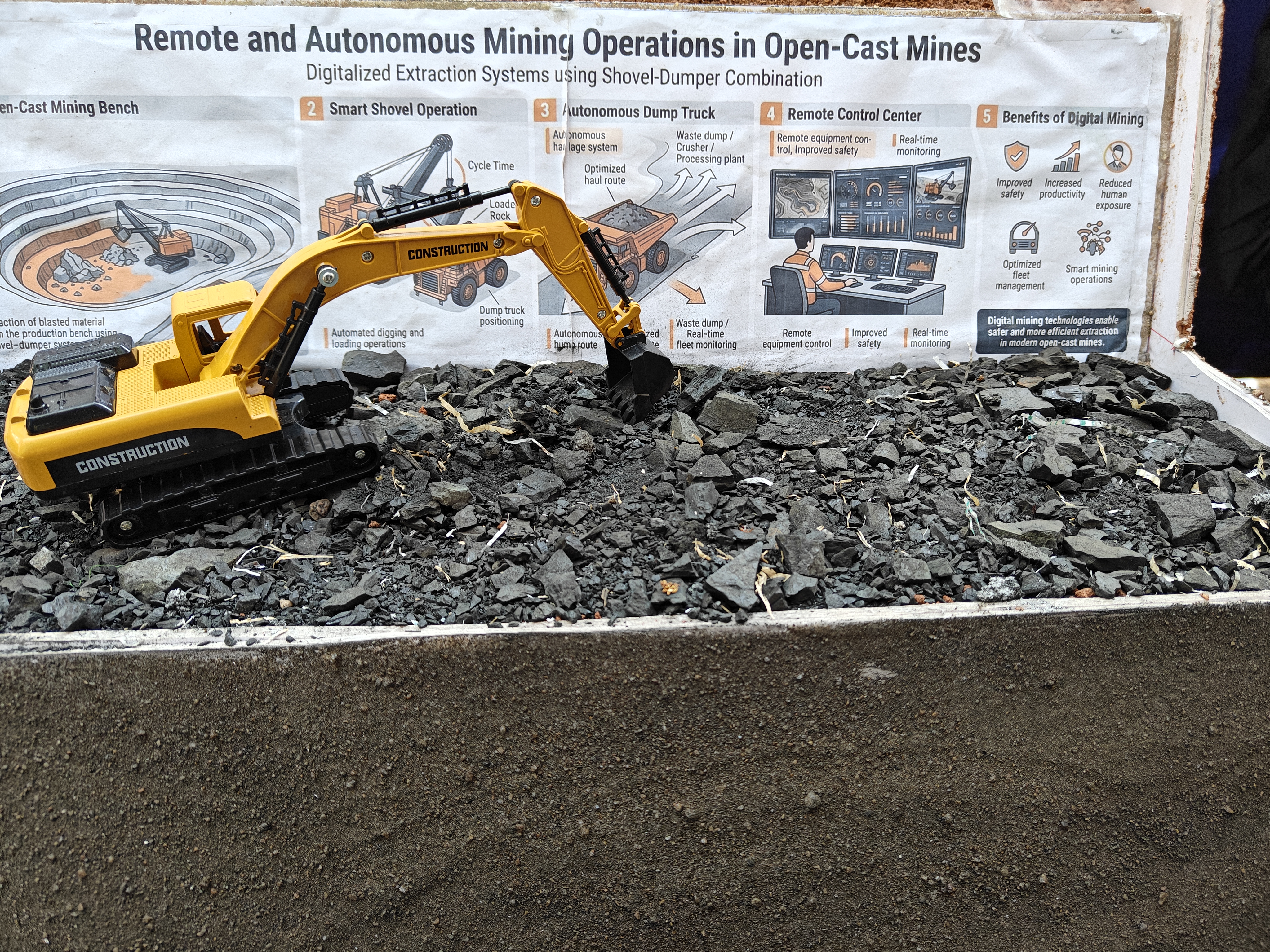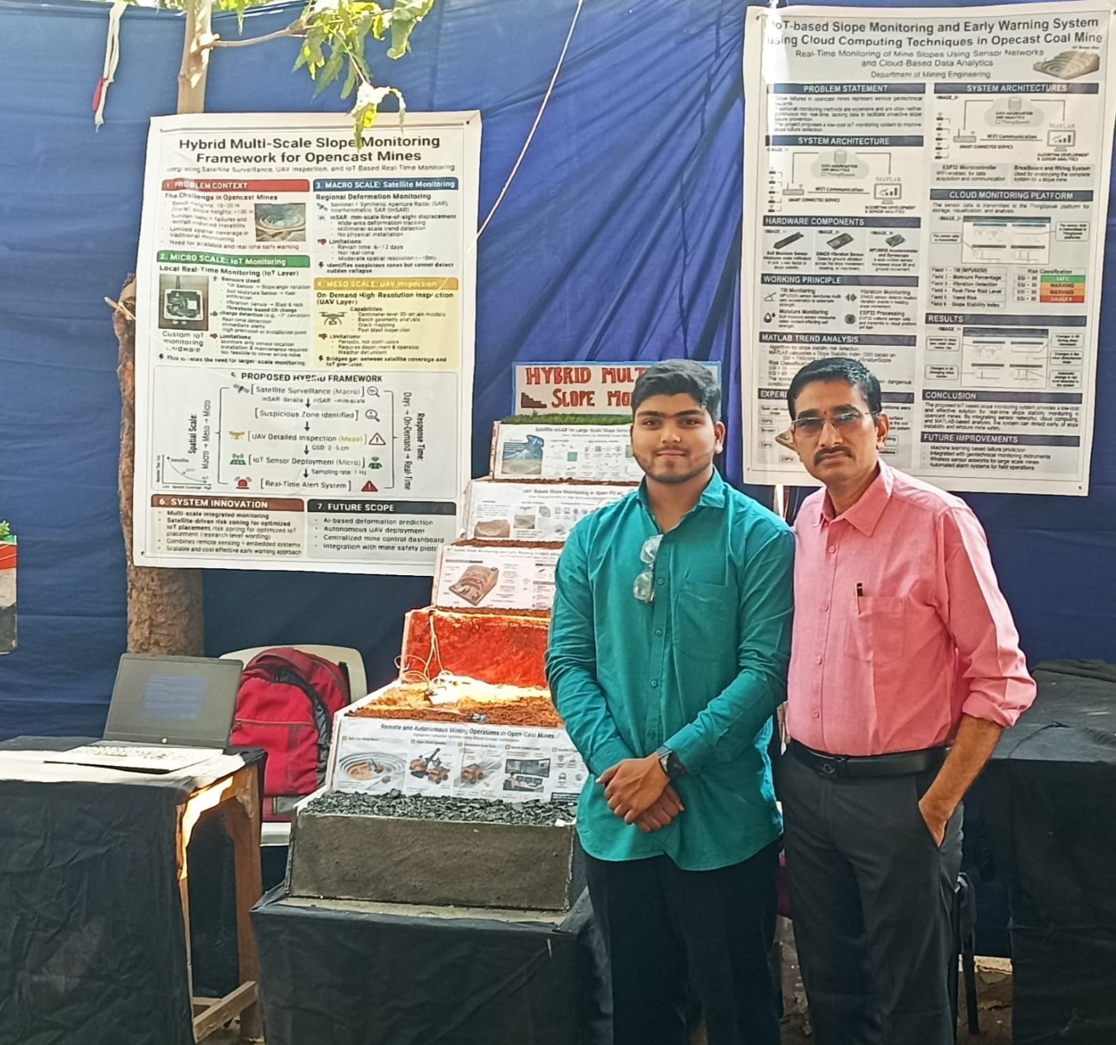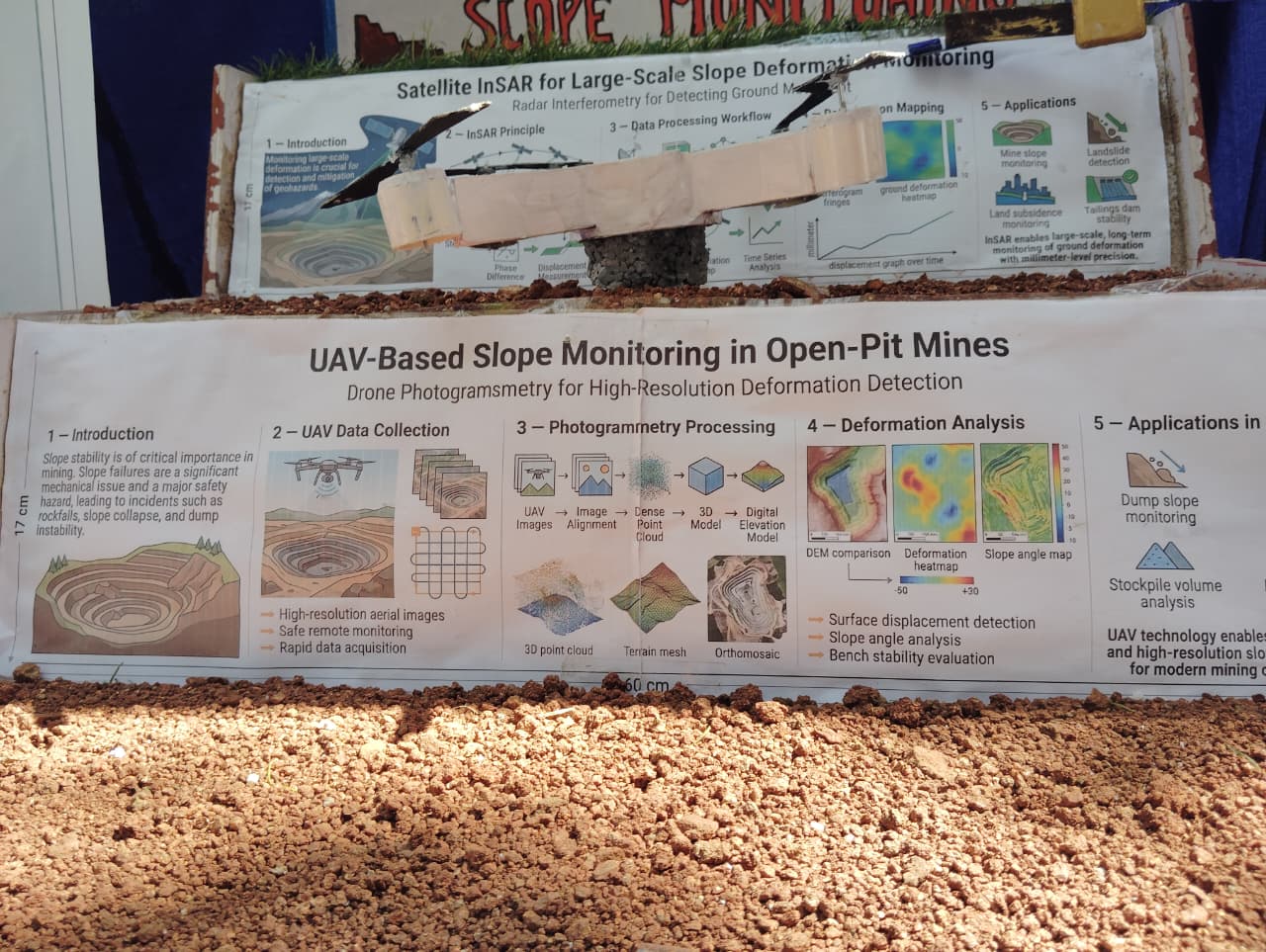 To demonstrate and validate the Hybrid Multi-Scale Slope Monitoring Framework, a physical scaled model of an open-cast mine was constructed in the laboratory. The model replicates the key structural features of a real mine โ including multiple excavated benches, slope faces, and waste dump areas.